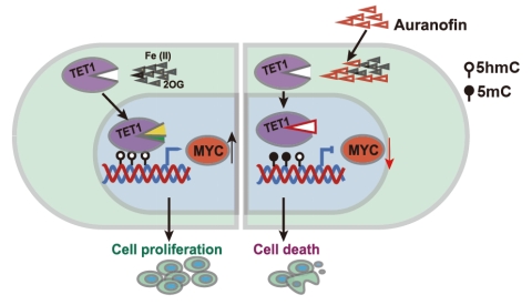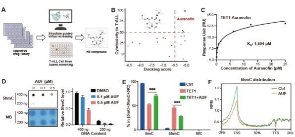 针对目前临床上TET1高效抑制剂缺乏的现状,研究团队利用结构引导虚拟筛选和细胞水平高通量药物筛选的策略,在超过2000个的FDA批准的上市药物库中,发现已批准上市的治疗类风湿性关节炎的药物-金诺芬(Auranofin)可以高效、特异性的抑制TET1蛋白酶活及下游功能。进一步研究发现,Auranofin通过与底物竞争性结合底物结合“口袋”,从而抑制TET1的催化活性。全基因组水平的DNA表观遗传(5-甲基胞嘧啶和5-强甲基胞嘧啶)测序进一步证实TET1的高效抑制导致多种基因启动子区DNA去甲基化过程的下调(5mC水平上调,5hmC水平下调),暗示TET1抑制剂可能通过甲基化抑制特定基因的表达从而调控T-ALL细胞的增殖;基于此设想,团队进一步证明TET1抑制通过表观遗传调控了原癌基因c-Myc表达的下调,从而介导了T-ALL的死亡。