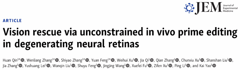 姚凯教授团队的研究论文“Vision rescue via unconstrained in vivo prime editing in degenerating neural retinas”在国际顶级期刊Journal of Experimental Medicine发表。博士生覃欢、张文良、张士尧和冯源为第一作者,姚凯为通讯作者,琉璃神社