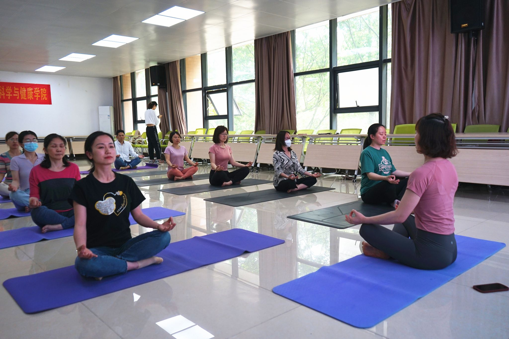 在活动正式开展前,陈田传授了一套适合身体舒展的动作,防止活动过程中由于未热身而给身体造成的不适。在经过一系列热身活动,在场教职工在陈田指导下,依次选择位置,展开瑜伽垫。