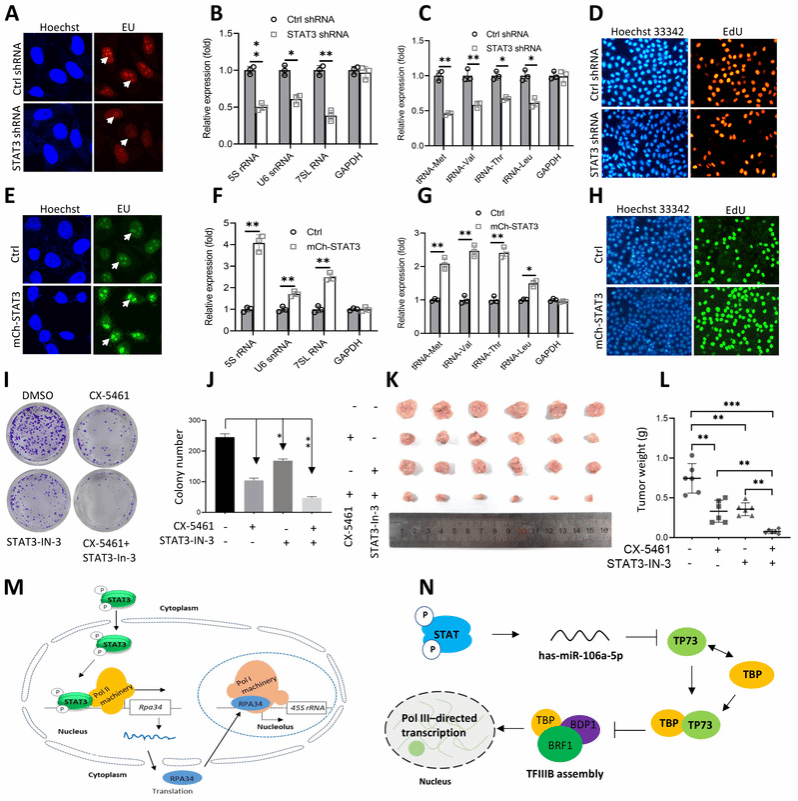 图1. STAT3调节Pol I和 Pol III指导的基因转录和癌细胞增殖。A) HepG2细胞EU染色结果显示STAT3沉默减少核仁中rRNA的表达;B,C)RT-qPCR结果显示STAT3沉默降低Pol III 产物的表达;D) EdU结果显示STAT3沉默抑制HepG2细胞增殖。E) HepG2细胞EU染色结果表明STAT3过表达增加核仁中rRNA的表达;F,G)RT-qPCR结果显示STAT3过表达促进Pol III 产物的表达。D) EdU结果显示STAT3过表达增加HepG2细胞增殖。I, J) STAT3 抑制剂和Pol I抑制剂对细胞克隆形成的影响。K, L) STAT3抑制剂和Pol I抑制剂对裸鼠成瘤的影响。M) STAT3 调节Pol I 转录的机制模型;N) STAT3调节Pol III 转录的机制模型。*, P<0 .05; **, P<0 .01; ***,P<0 .001.